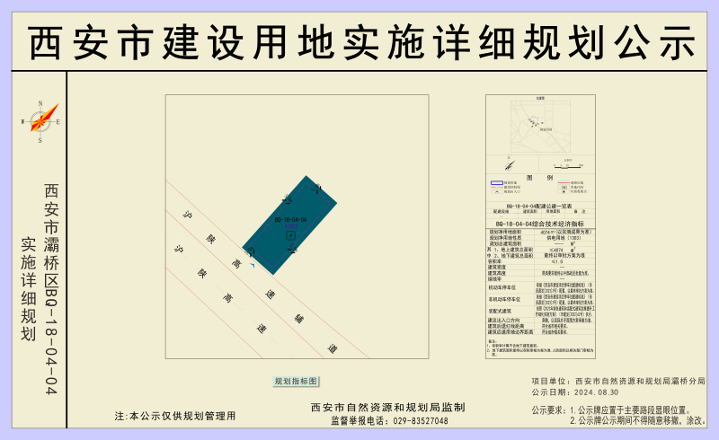 BQ-18-04-04实施详细规划位于西安市灞桥区行政管辖区内,沪陕高速辅道以北,规划西延高铁以西,规划路以东,规划路以南。净用地面积6.111亩。用地在《西安城市总体规划(2008-2020)(2017年修订)》范围外,在《灞桥区国土空间总体规划(2021-2035年)》中为供电用地(1303)。本次实施详细规划指标如下:规划用地性质为供电用地(1303),规划净用地面积约6.111亩,容积率≤1.0,地上建筑面积≤4074㎡,地下建筑面积最终面积以方案审核为准,人防面积以人防部门审批为准。绿地率≥5%,建筑高度以机场管理部门批复为准。