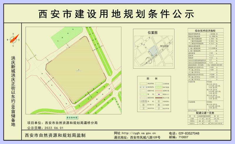 该宗用地位于西安市灞桥区内,洪庆新城洪庆正街以东,连霍高速以北,规划净用地约9.5417Ha,用地性质为工业用地(M),容积率≤1.2,建筑密度≥40%,绿地率≤15%,机动车停车位458个,非机动车停车位2290个,地上建筑面积114500平方米,其中行政办公及生活服务设施用地面积比例≤7%,行政办公及生活服务设施建筑面积比例≤15%。