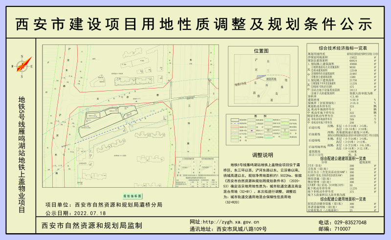地铁5号线雁鸣湖站地铁上盖物业项目位于灞桥区,东三环以西,浐河东路以东,云淙巷以南,绕城高速以北,规划净用地面积约1.5022Ha。在《西安城市总体规划(2008-2020年)》(2017年修订)中,规划净用地的用地性质为二类居住用地(R2)。依据2020年3月4日西安市自然资源和规划局核发规划条件确定:用地性质为轨道交通用地混合商业用地(S2+B1)。本次拟调整为城市轨道交通用地混合保障性住房用地(S2+R20)。