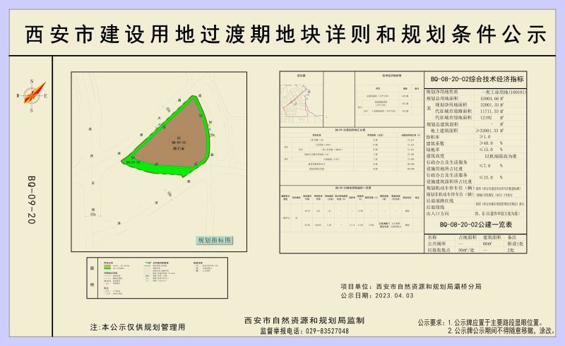 BQ-09-20地块位于西安市灞桥区BQ-09单元内,北至洪原大道、西至洪庆河、南至洪河路、东至规划路,规划净用地面积约4.42公顷(约66.290亩)。BQ-09-20-02宗地在上述地块范围内,规划净用地面积约3.20公顷。具体规划指标如下: