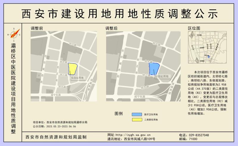 本次项目位于西安市灞桥区纺织城街道内,北邻纺七路、南邻纺八路、东依规划路。拟将规划净用地面积为2.958公顷(44.370亩)的二类居住用地(R2)变更为医疗卫生用地(A5),变更后与总规修改相比,二类居住用地(R2)减少2.958公顷,医疗卫生用地(A5)增加2.958公顷,强制性用地增加。