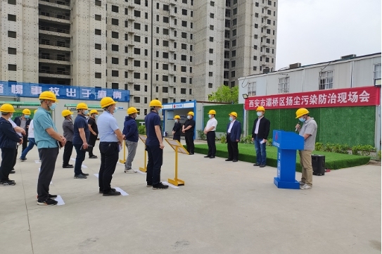 5月18日下午,为切实解决当前辖区生态环境突出问题,进一步优化施工工地扬尘治理工作,区生态委办在当代镜项目部现场组织召开了“灞桥区工地扬尘污染防治现场会”。灞桥副区长李刚毅,区政府办、区住建局、区城市管理局、区秦岭保护局、生态环境灞桥分局、区城棚改中心、灞河新区建设局、灞河新区市政公用局、区城建开发公司,各街道办事处,园区管委会等相关分管领导及在建项目单位相关代表人共50余人参加。现场会由区生态委办副主任、生态环境灞桥分局局长郑树主持。  灞桥副区长李刚毅带领各部门了解当代镜项目工地工程进度,实地察看了各项扬尘防治措施落实情况,了解了防尘设备的使用情况。