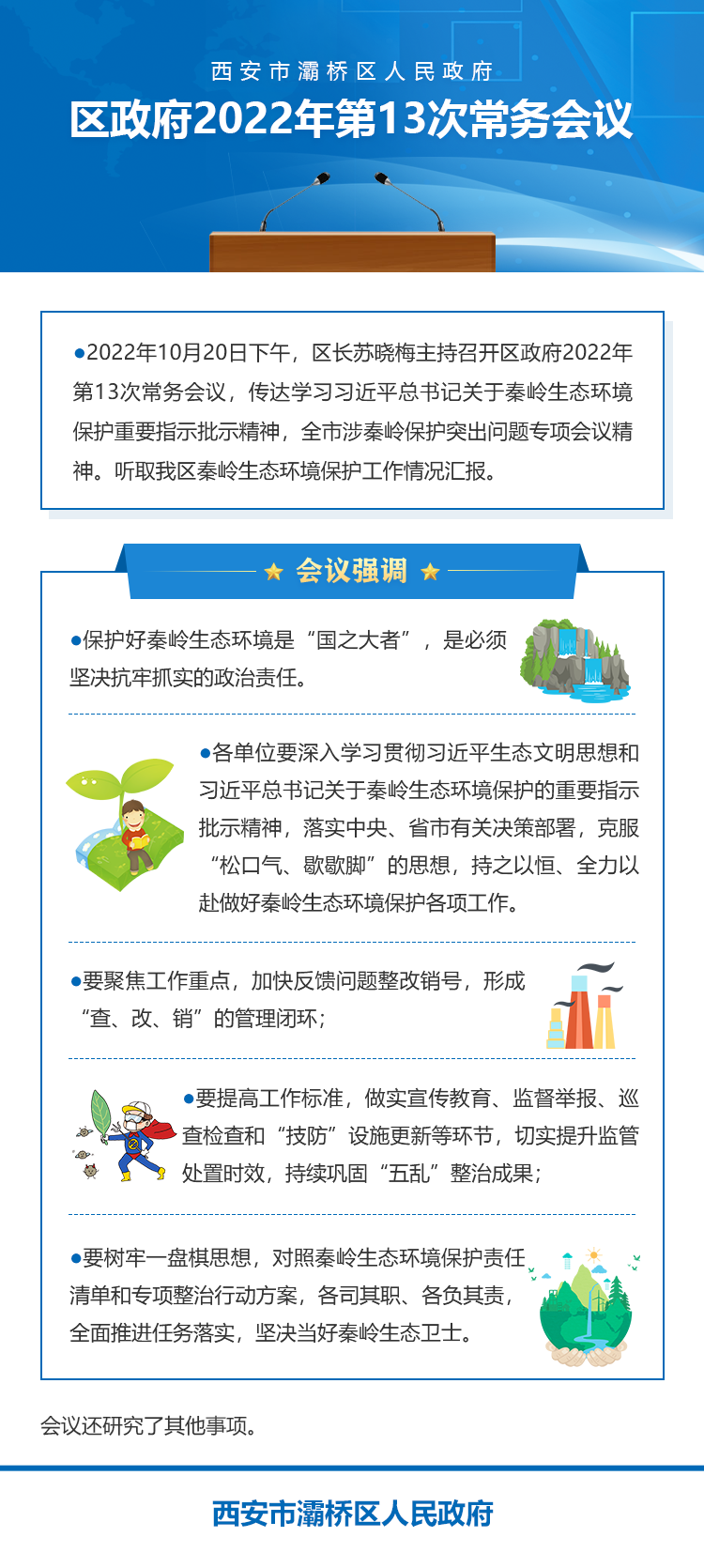 2022年10月20日下午,区长苏晓梅主持召开区政府2022年第13次常务会议,传达学习习近平总书记关于秦岭生态环境保护重要指示批示精神,全市涉秦岭保护突出问题专项会议精神。听取我区秦岭生态环境保护工作情况汇报。