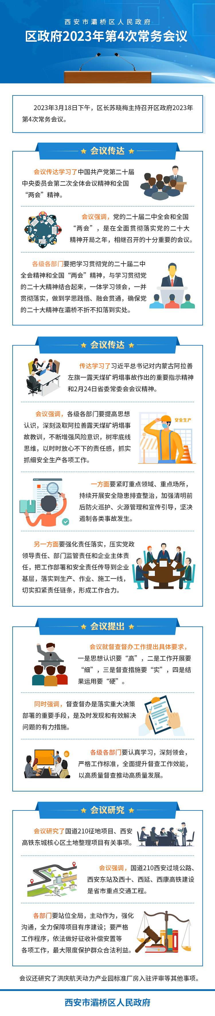 会议传达学习了中国共产党第二十届中央委员会第二次全体会议精神和全国两会精神。会议强调,党的二十届二中全会和全国两会,是在全面贯彻落实党的二十大精神开局之年,相继召开的十分重要的会议。各级各部门要把学习贯彻党的二十届二中全会精神和全国两会精神,与学习贯彻党的二十大精神结合起来,一体学习领会,一并贯彻落实,做到学思践悟、融会贯通,确保党的二十大精神在灞桥不折不扣落到实处。